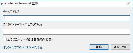 法人でのご利用の場合、PINコードを登録したメールアドレスをpriPrinter本体にプロダクトキーと登録します。ユーザー毎に異なるメールアドレスの登録はできませんのでご注意ください。